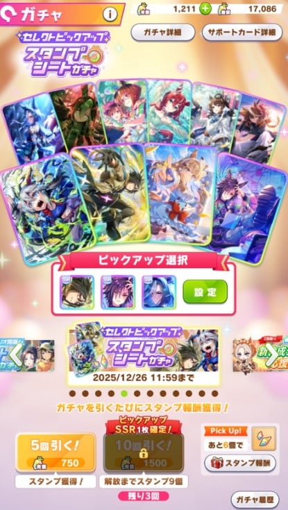 ここで選択したサポカがスタンプ10個貯めると引ける10連でこの中から1枚確定でもらえる。(当然ランダム)