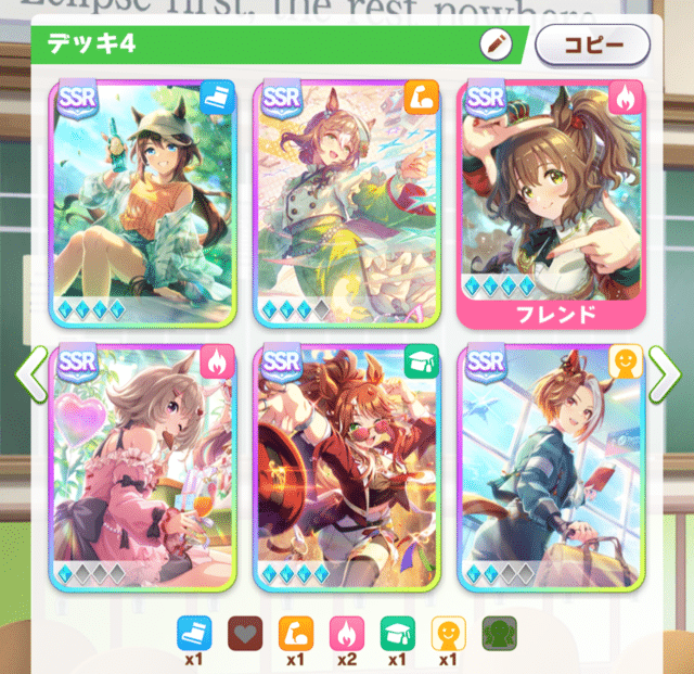 • 随分前からどのシナリオでもサポカと関係ないウマ娘が練習に加わるんだし、その枠をサブ編成としてSR以下のサポカでしていさせれくれれば良いのに。