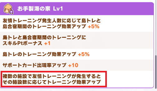 あと海の家の性能について補足されてる方いますが、Lv0だとシニア3人でもスキポ200いかなかったりするくらい変わるのでLv1にするが大事。つまりジュニア最初に海の家を上げずに他トレ光らせても実は思ったより差が出てなかったりする。