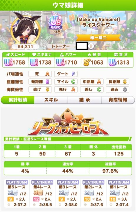 • 長距離の逃げハロウィンライスは以前は多数ランキング入りしていたはずだしやれる範囲であることは前提として、現環境でも採用して96傑はあっぱれである