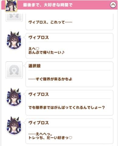 ヴィブロスのシナリオはジメジメした姉ちゃんたちに元気を与えるしドバイのためにがんばるち!するしトレーナーともかなりイチャイチャするからスティルの後にやると心が生き返るぞ