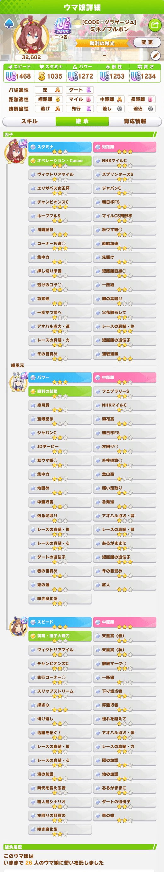 因子周回で全距離走れて、短因子(親は中2)にするってなるとなかなか候補がいなかった。