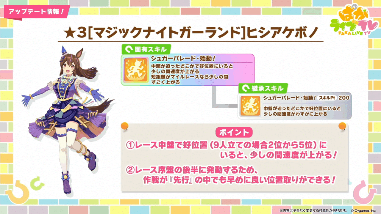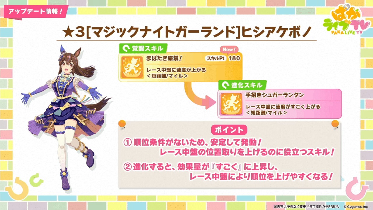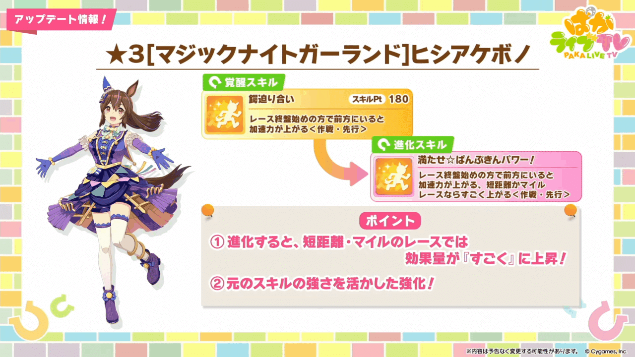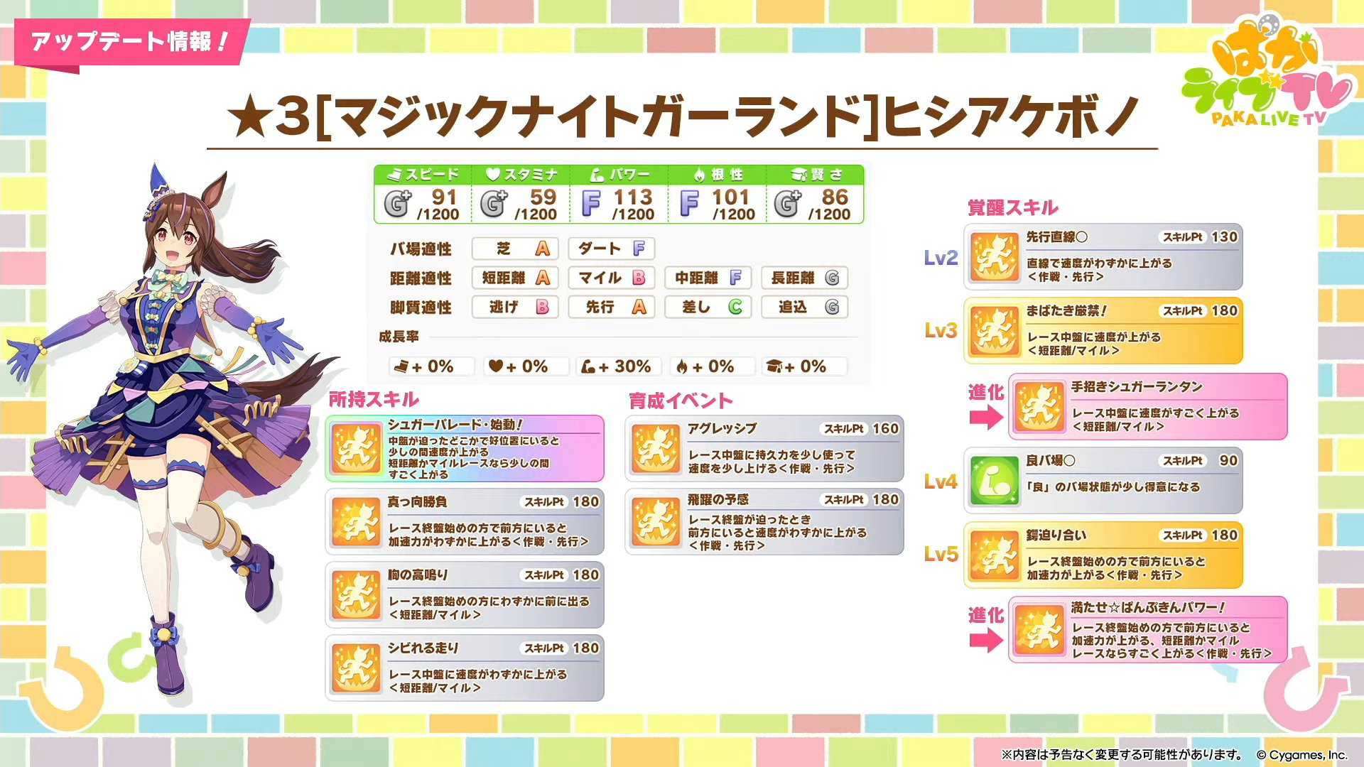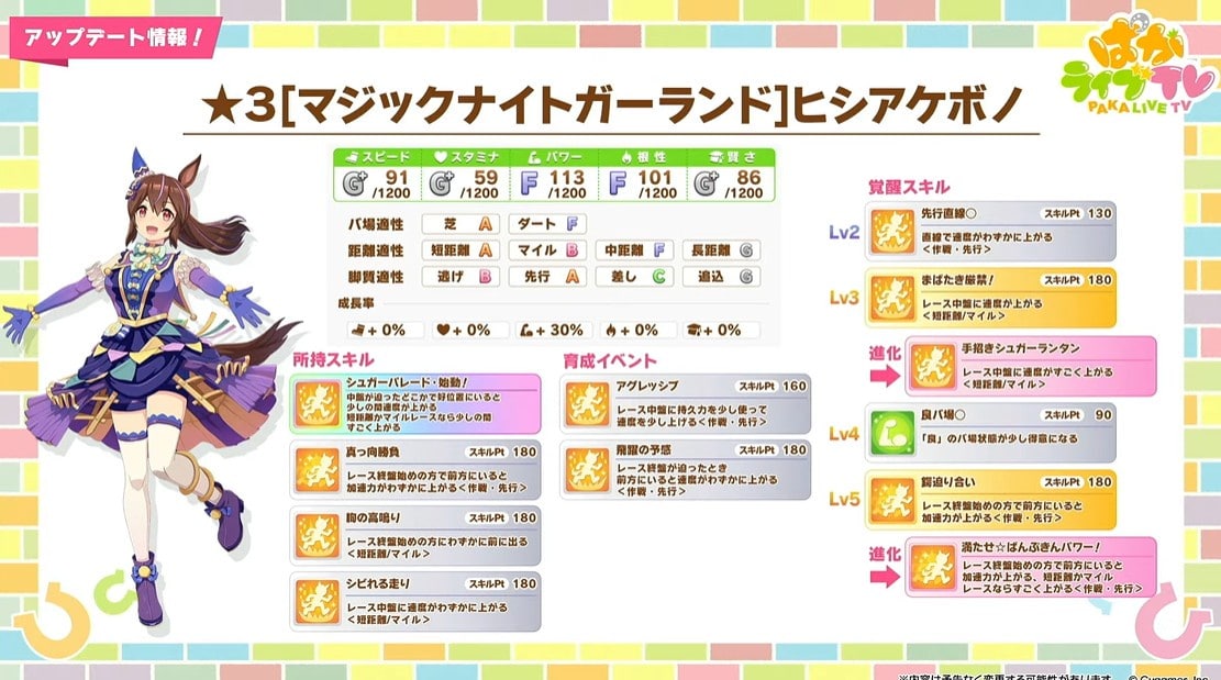 【ウマ娘】★3育成ウマ娘別衣装「ヒシアケボノ」は先行・短距離マイル特化で、鍔迫り合い進化持ち!癖がなく汎用性が高くて無難に強そう。