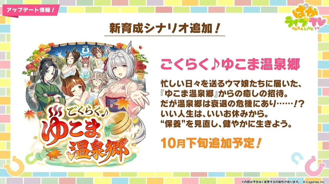 【ウマ娘】今度は温泉が舞台!? 新育成シナリオ “ごくらく♪ゆこま温泉郷” は10月下旬公開予定!!「温泉とかまずいですよ」