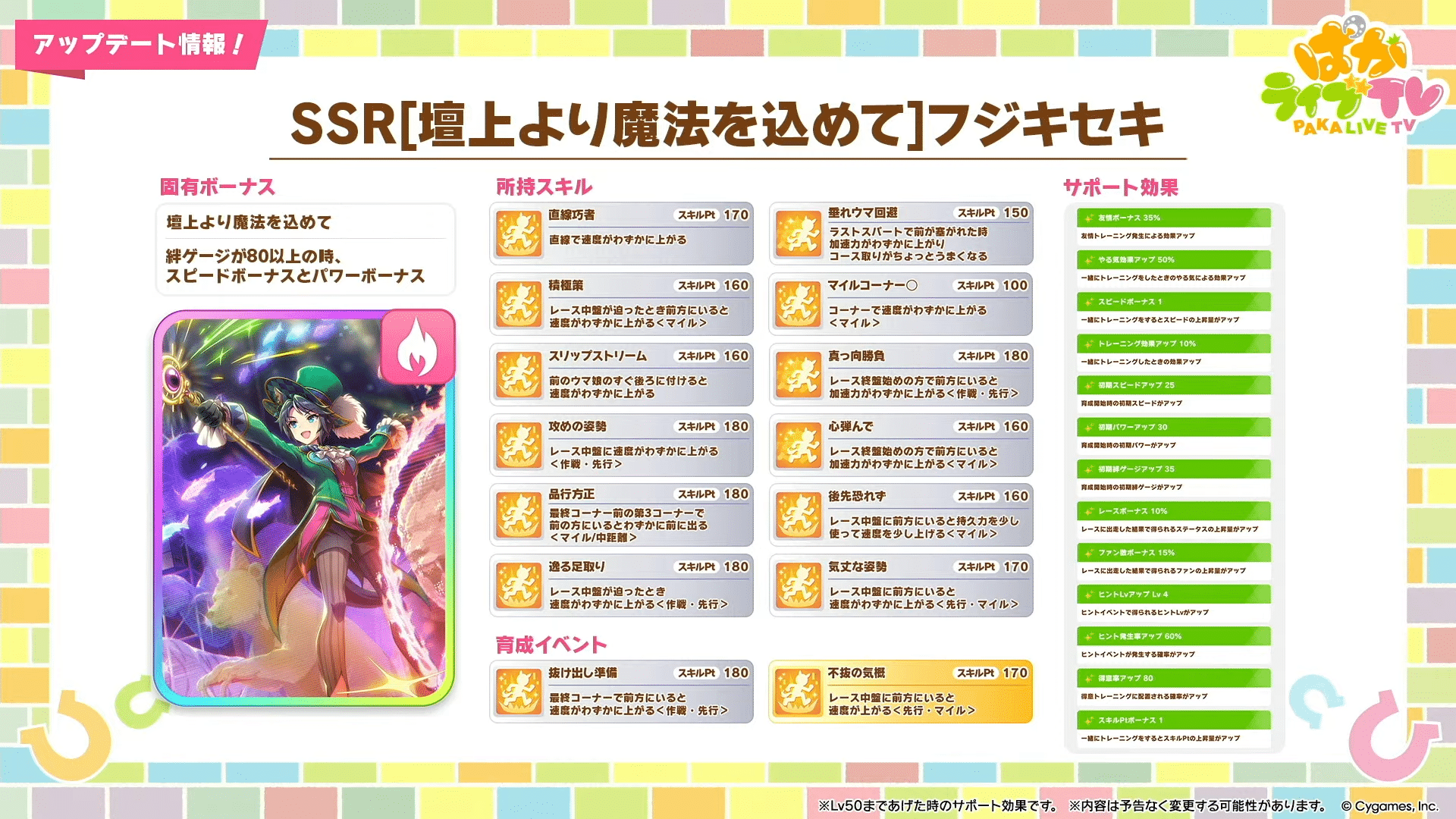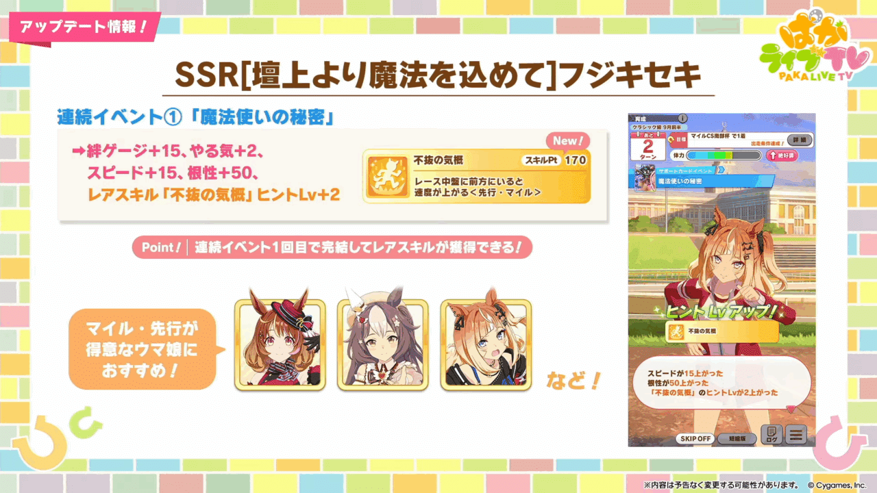 【ウマ娘】新SSRサポカ「フジキセキ」は先行・マイル特化でヒントスキルが12個!!金スキルは1個だけど連続イベは1回のみ! しかしまた根性か…。
