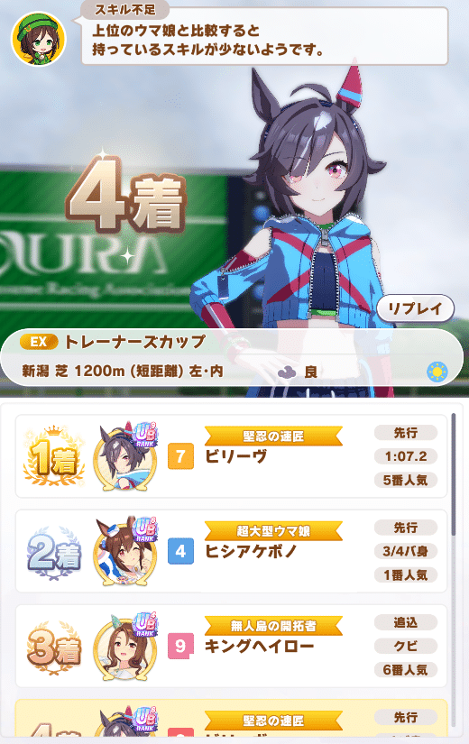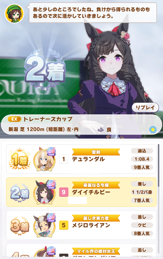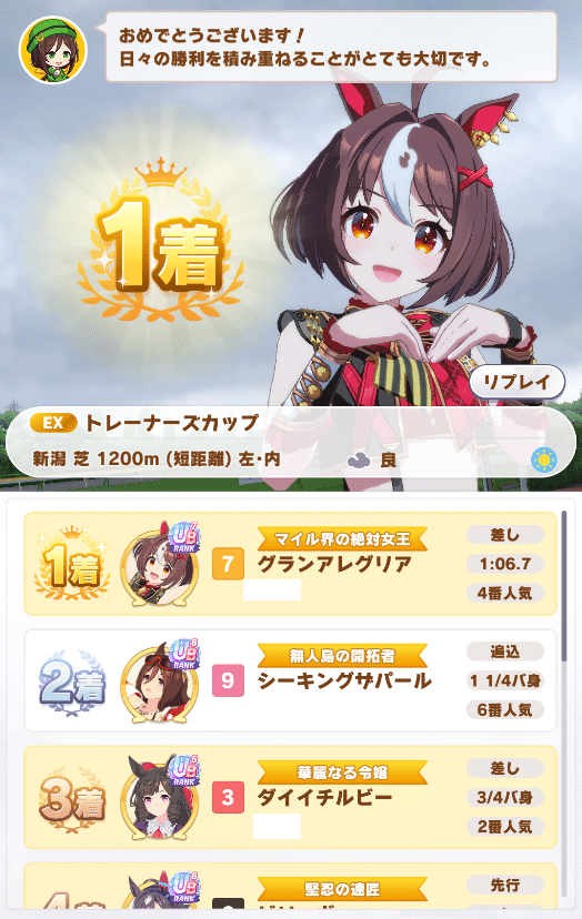ワイのアレグリアが5位くらいで終盤近づくと急に道を譲ってうちが2位とかになるんや…