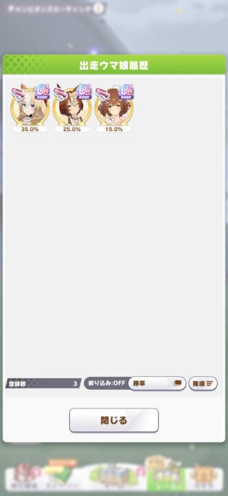 終盤直前にゴルシが慧眼威風をダブル発動してくると一足飛びが着火できずに加速不足になるのやばすぎるのだ…たまたまスプリントギアがドンピシャで決まらなかったら危ないところだったのだ