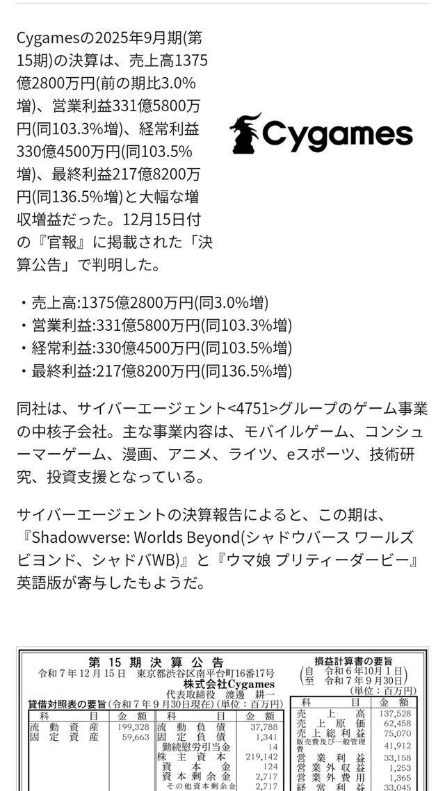 Cygames、25年9月期の決算は営業利益103%増の331億円と大幅増益…『シャドバWB』と『ウマ娘』英語版が貢献