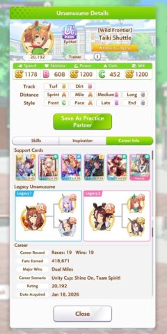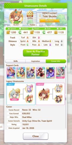 1位のタイキさんは育成中に20回近くレースに追加出走して勝利ボーナスとレアスキル+1個分のPtで僅差勝ちしています