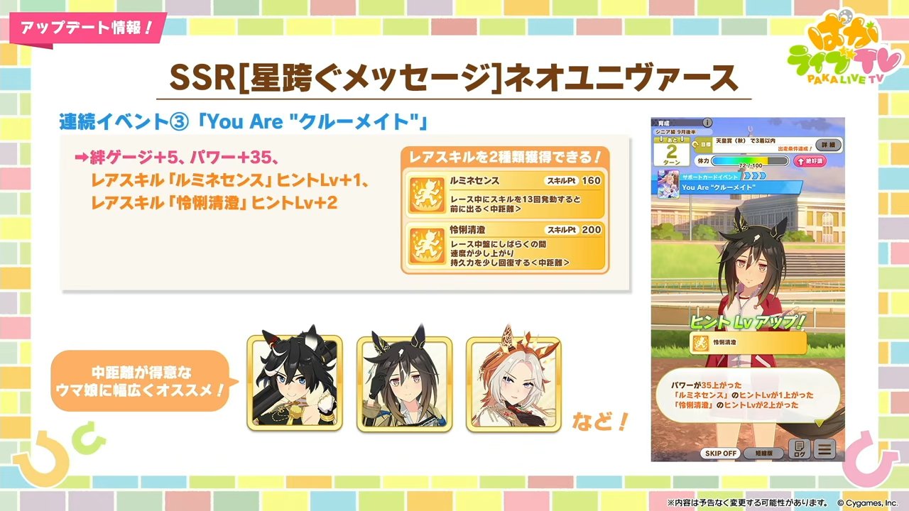 【ウマ娘】SSR新サポカ「ネオユニヴァース」が実装決定!パワータイプで中距離完全特化!怜悧とルミネセンスの金2種持ちでスキポも2!中距離限定だけど滅茶苦茶強いな…