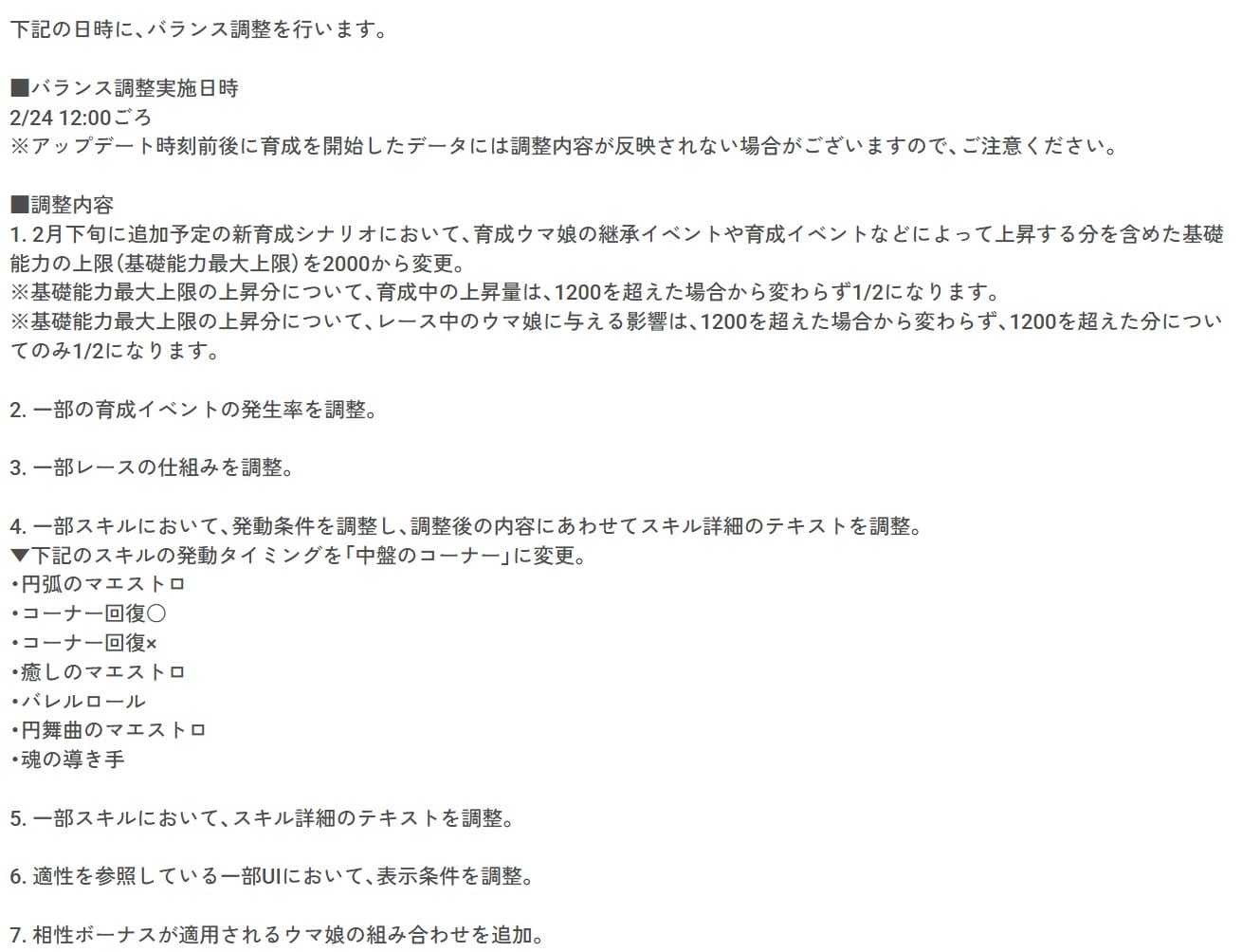 1. 2月下旬に追加予定の新育成シナリオにおいて、育成ウマ娘の継承イベントや育成イベントなどによって上昇する分を含めた基礎能力の上限(基礎能力最大上限)を2000から変更。
