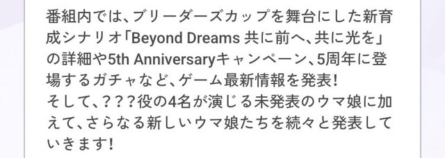 【ウマ娘】アーモンドアイはやはり確定か!? 次回5周年のぱかライブTVは2月22日(日)20:00配信予定!新ウマ娘の「???」役は今回4名発表されるらしいぞ!