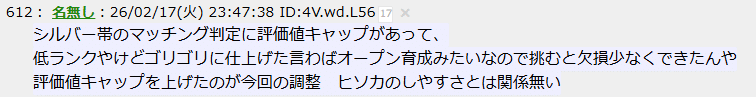 4日目のマッチングでプラチナ入りしたらプラチナと当たる以上、結局上澄み近いのと当たるのは変わらんだろうしなぁ