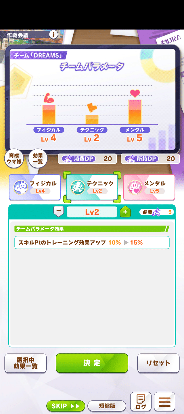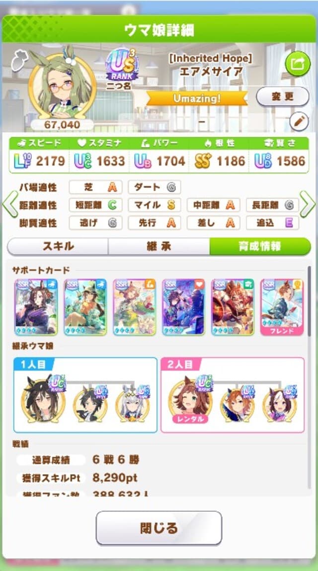 真ん中をカンストまで伸ばす旨味も少ないし、この辺のバランスはよくわからんけど〇-8-8の振り分けは大富豪のサポカ編成なんやなってのはわかった