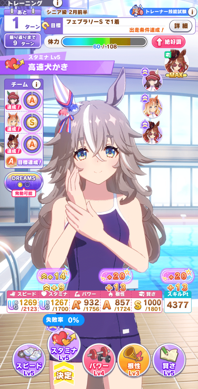 シニアで友情トレ+爆発のスタミナを回数叩けないと根性1200に届かないけど、ジュニアでこれやってると保険が効いて良い感じ。(上振れの上振れ狙いではないですが)
