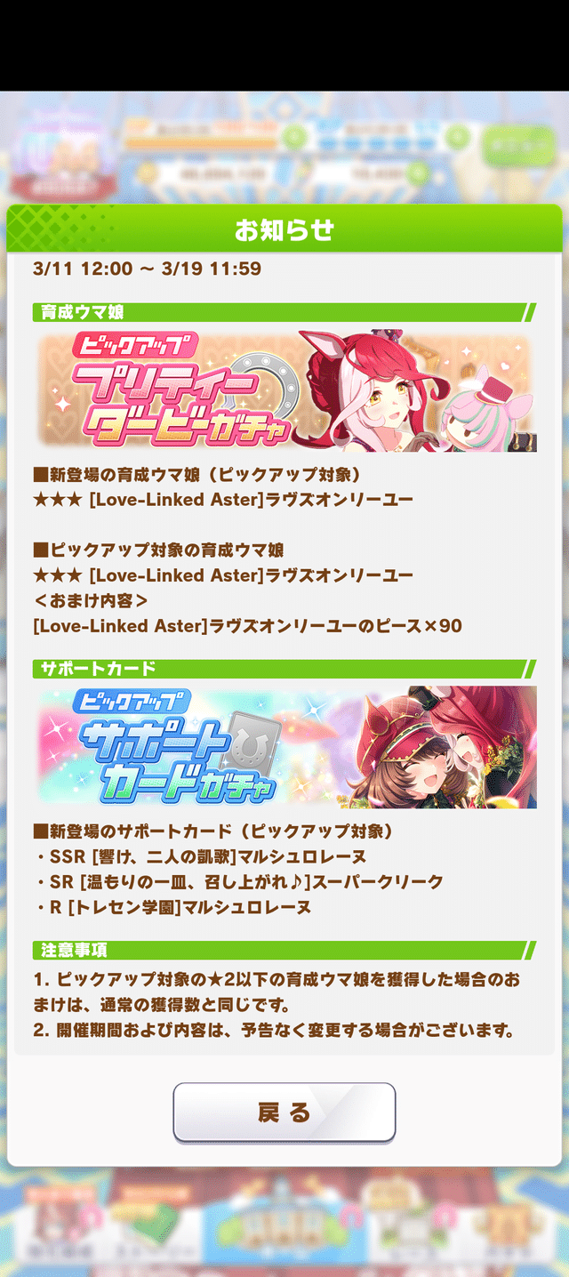 【ウマ娘】次回3/11(水)のガチャ更新は☆3育成ウマ娘新衣装「ラヴズオンリーユー」にSSRサポカ「マルシュロレーヌ」に決定!!