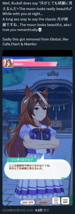 クソ翻訳でシンボリルドルフが愛の告白してくるシーンが改変削除されてるって向こうのウマ娘界隈だと騒がれてるみたいだな