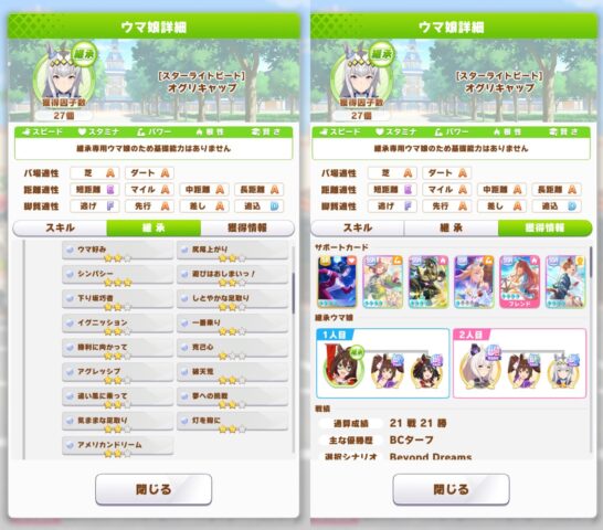 こう見るとサポカ1枚増えてスキル獲得数が増えてる?かもしれないのに全体的にちょっと下がってるようにも見えるけど誤差かもしれない。あんまり気にしないでも良さそう?