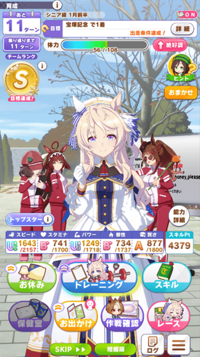 最近は紫3つでトレゴミだったら合宿でもレース出たりしてる。思い切って1ターン捨てる勇気も大事。(場合によっては逆に紫3つでもドリトレしたり)