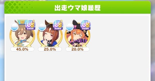 管理人が今回使用したウマ娘の編成は逃げ3(マヤ、ファルコ、トラン)