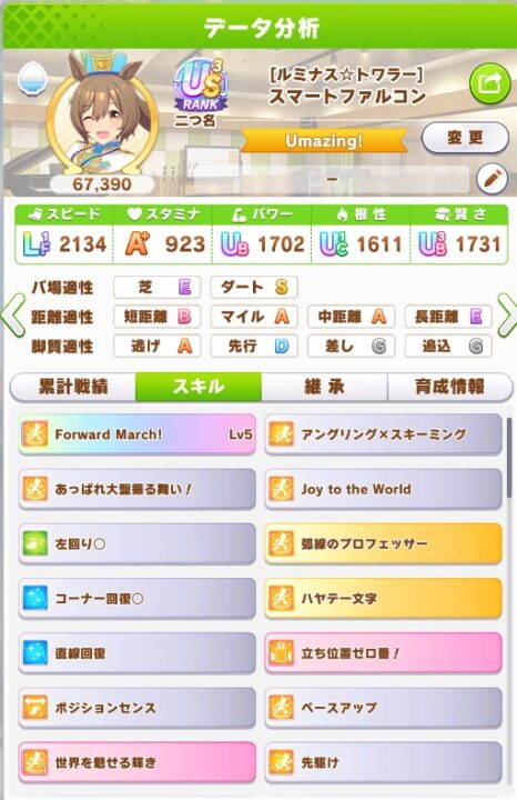 青ファルコ 切れ有りだけど距離S無し、根性編成(怜悧など含む回復スキルは合計6)
