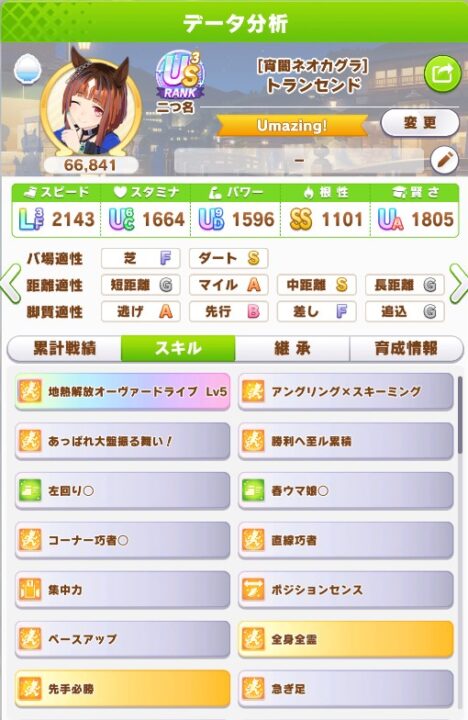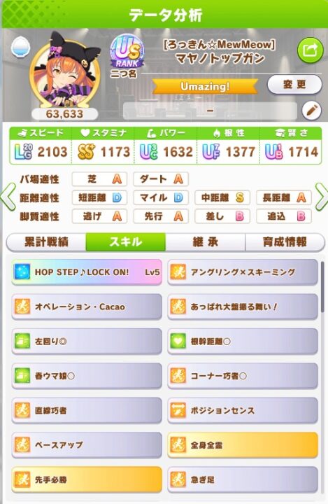 スキルの関係で比較的序盤で前に出にくい猫マヤは、追い越し禁止区間の影響もあってか固有スキルの発動が安定しないのでスペック以上に活躍できていない印象