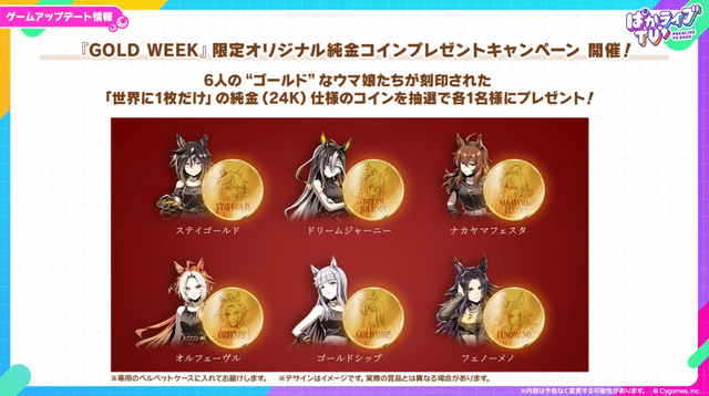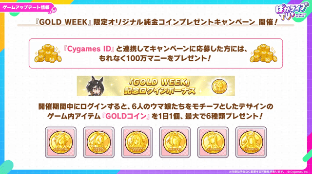 【ウマ娘】今年のGWキャンペーンはステゴ一族が勢揃いな「GOLD WEEK」に決定!純金コインが当たるキャンペーンも!!